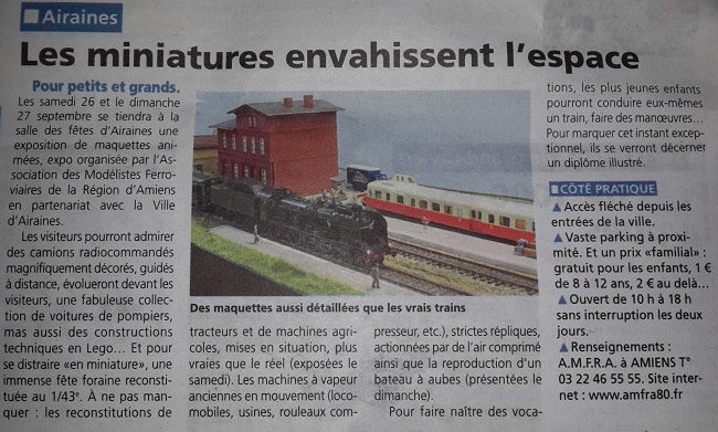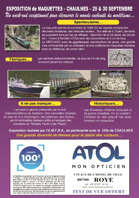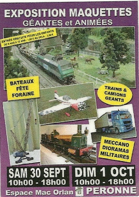L'AMFRA organise une exposition de maquettes au Centre Socio-Culturel de Chaulnes le dernier week-end de septembre, les 29 et 30. Les différents thèmes du modélisme sont présentés.