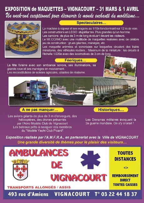 L'AMFRA organise sa première exposition de l'année à la salle polyvalente de Vignacourt le week-end de Pâques, les 31 mars et 01 avril. Les différents thèmes du modélisme sont présentés.