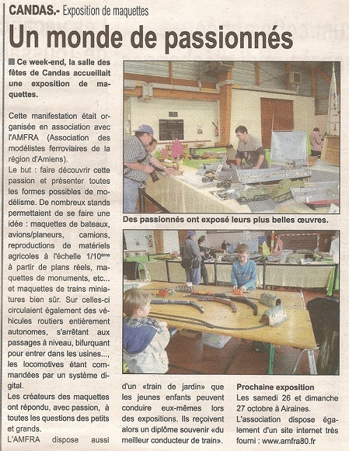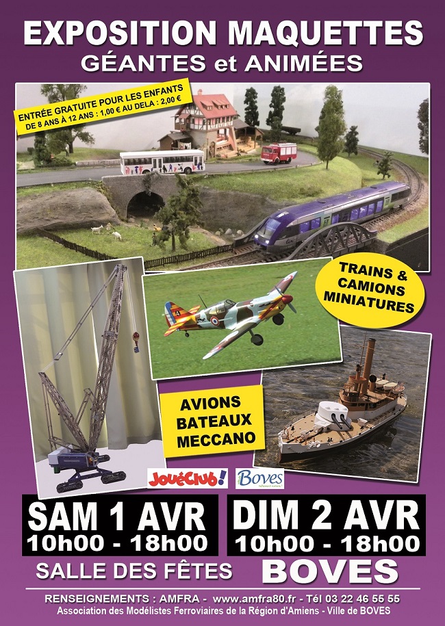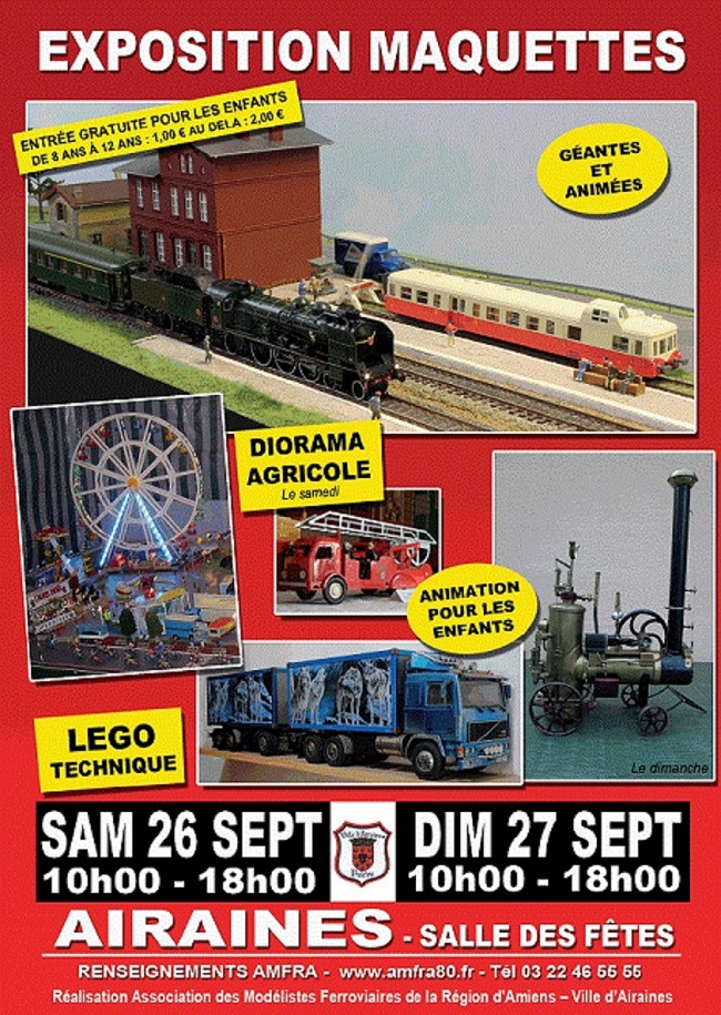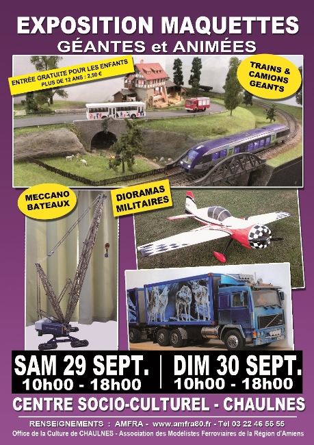 L'AMFRA organise une exposition de maquettes au Centre Socio-Culturel de Chaulnes le dernier week-end de septembre, les 29 et 30. Les différents thèmes du modélisme sont présentés.
