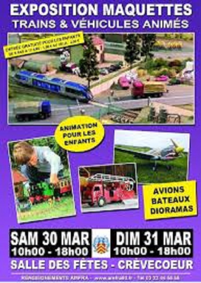 L'AMFRA organise sa seconde exposition de l'année à la salle des fêtes de Grandvilliers, les 09 et 10 avril. Les différents thèmes du modélisme sont présentés.