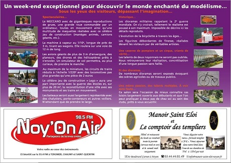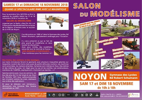 Avec le soutien de la ville de Noyon, L'AMFRA et la radio "Noy'On Air" organisent un salon de maquettes au gymnase des lycées, boulevard Robert Schumann, le week-end des 17 et 18 novembre. Les différentes disciplines du modélisme sont présentées sur 1000 m2.