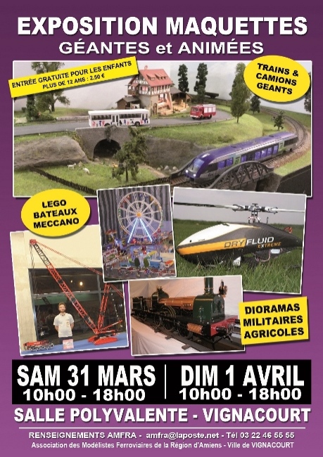 L'AMFRA organise sa première exposition de l'année à la salle polyvalente de Vignacourt le week-end de Pâques, les 31 mars et 01 avril. Les différents thèmes du modélisme sont présentés.