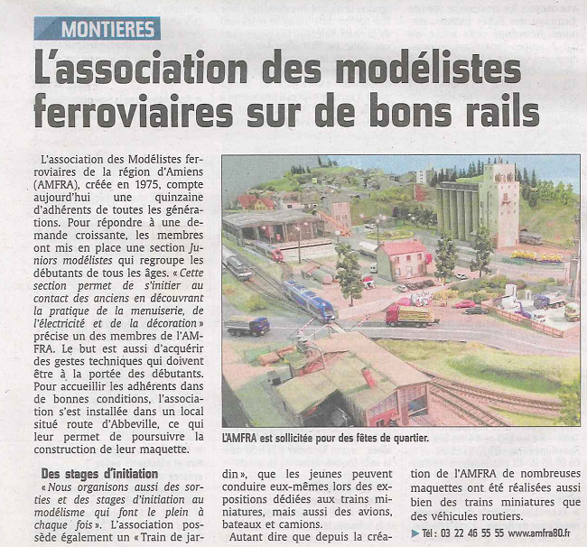 Qui sommes nous?L'AMFRA (l'Association des Modélistes Ferroviaires de la Région d'Amiens) est une association créée en 1975 sur Amiens. L'AMFRA est affiliée à la Fédération Française de Modélisme Ferroviaire (FFMF). Cette association a pour but de faire connaitre le monde passionnant du train miniature dans toutes ses échelles (H0, N, ...), géré soit en analogique (exemple: Transfo continu JOUEF) ou en numérique (Exemple: Centrale ROCO Multimaus). Nous disposons d'un local où nous nous réunissons les samedis après-midi pour faire évoluer nos réseaux, nous entraider mais aussi aborder les diverses nouveautés et techniques grâce à des ateliers spécifiques. Donc si le monde du train miniature vous passionne, vous pouvez nous contacter ou vous rendre dans nos expositions. Voici un article du Courrier Picard (édition du 05/02/2015) présentant notre Association.