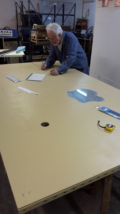 Jean-Pierre prépare le gabarit pour la pose des voies